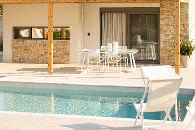 Our exclusive new villa resort is carefully designed to give our guests exactly what they’ve been looking for. Villa Alia has 2 bedrooms, 3 bathrooms, its own private pool, luxury modern accommodation and spacious grounds to relax and enjoy. All of this while also being less than a minute from the crystal clear waters and soft sands of the Aegean shore. It’s a dream holiday come true!