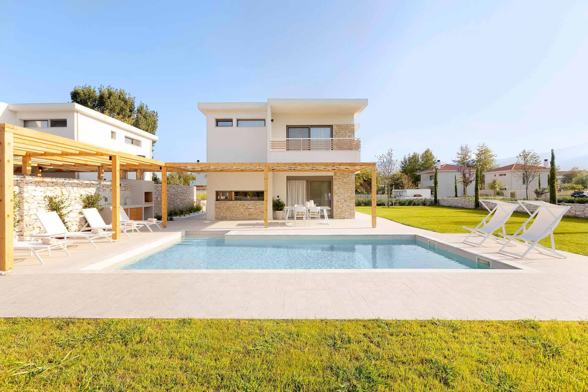 Our exclusive new villa resort is carefully designed to give our guests exactly what they’ve been looking for. Villa Eudora has 2 bedrooms, 3 bathrooms, its own private pool, luxury modern accommodation and spacious grounds to relax and enjoy. All of this while also being less than a minute from the crystal clear waters and soft sands of the Aegean shore. It’s a dream holiday come true!